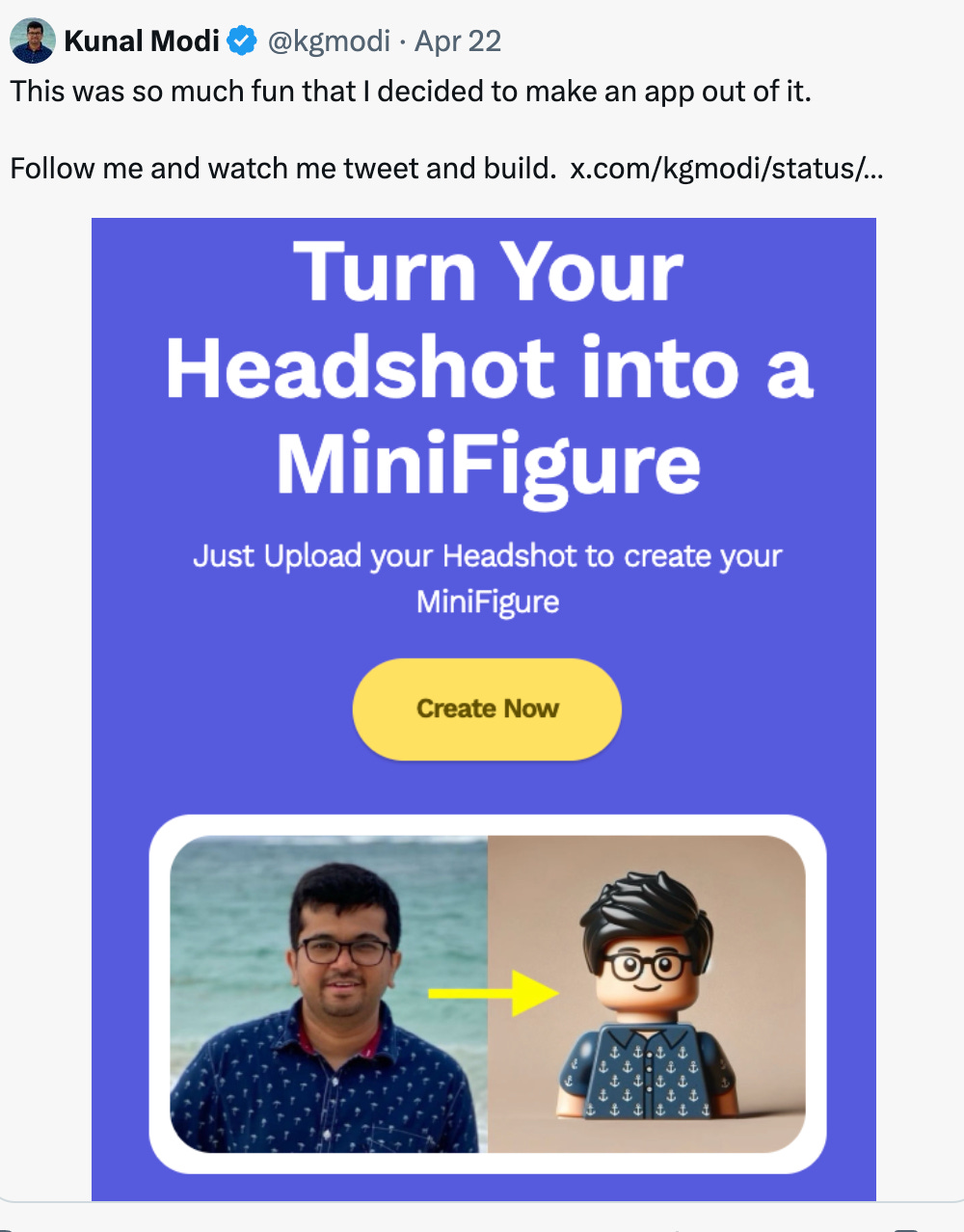I was curious about what it would take to build a one-click solution. That's how the idea for MiniFigureAI.com was born. I spent the next 12 hours building the app. If there's one thing I've learned over the past year, it's this: Building an app is step 0. Getting your app to reach users is the real start of the journey.