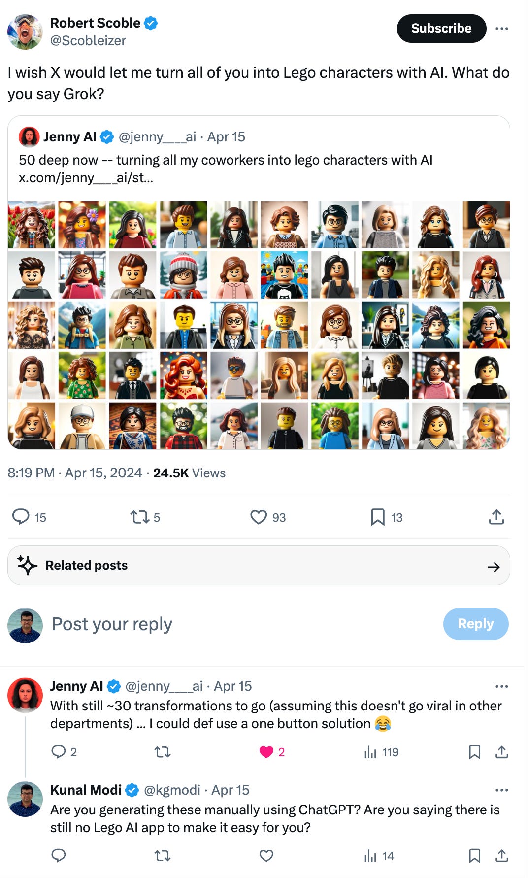 I found someone on X making minifigures one-by-one using ChatGPT, which was cumbersome for them. Below is a screenshot from the conversation.